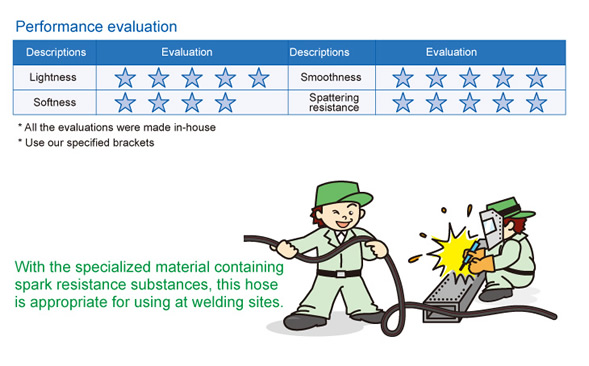 Features : Compared to conventional urethane hoses, this hose has greater resistance against sparks due to the inclusion of spark resistance substances, which is appropriate for using at welding sites and automobile service garages, etc.