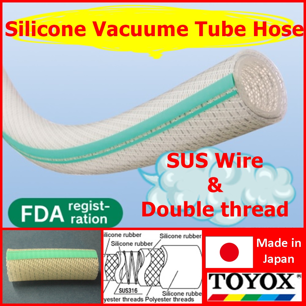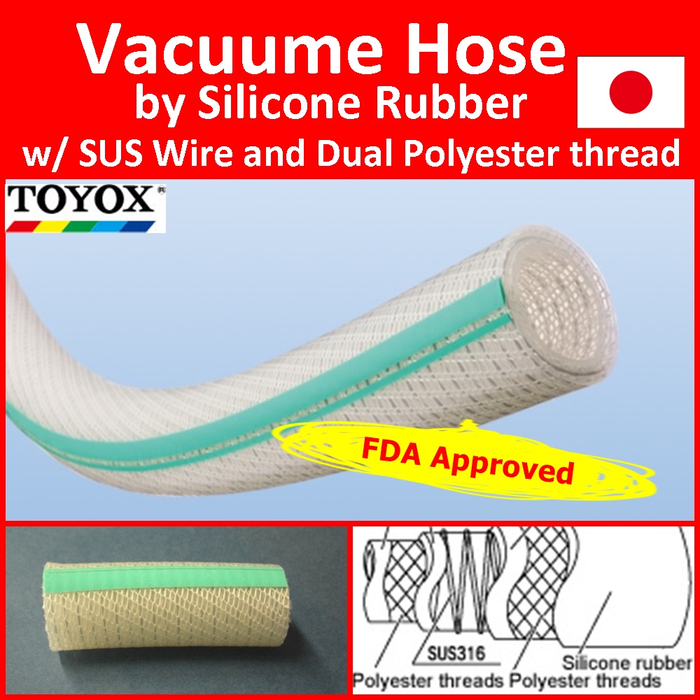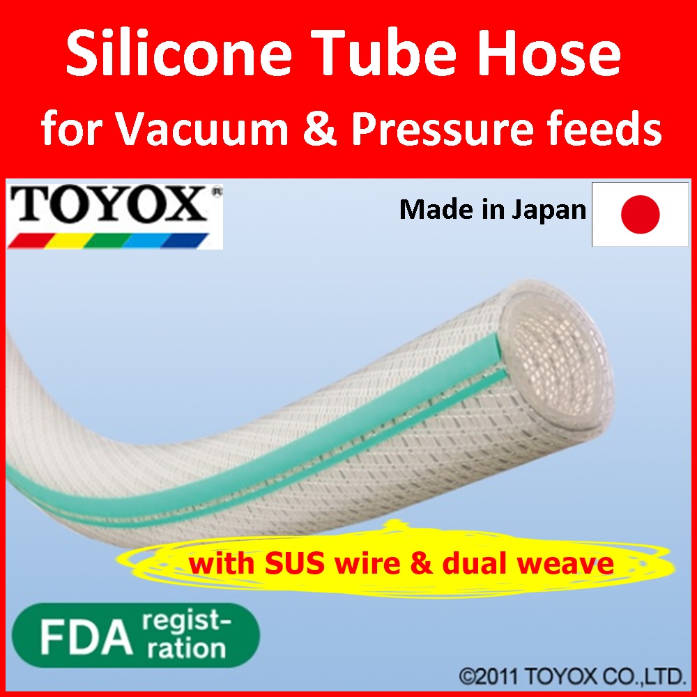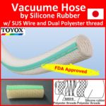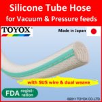 Made of silicone rubber and able to handle pressure and vacuum feeds, pressure and heat, the TOYOSILICONE Hose has the excellent features of silicone such as heat resistance up to 150°C, and low leaching, insulation, and no odor. It can be used in equipment for the food industry, pharmaceutical industry, semiconductor industry, industrial furnace industry and more. Resistant against breaking and collapsing because of its SUS 316 stainless steel reinforcing coil, the TOYOSILICONE Hose is compatible with a wide range of genuine Toyox couplings and delivers high production efficiency.